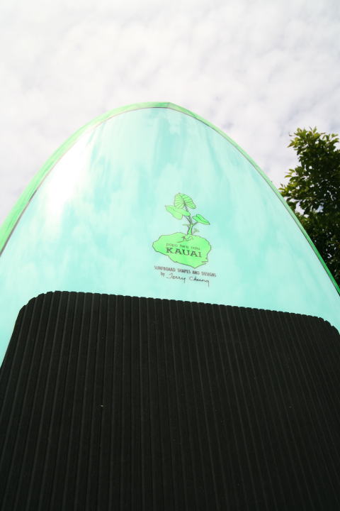 このボードは、テリーチャン自身がハンドシェープしたカスタムSUPボードです。